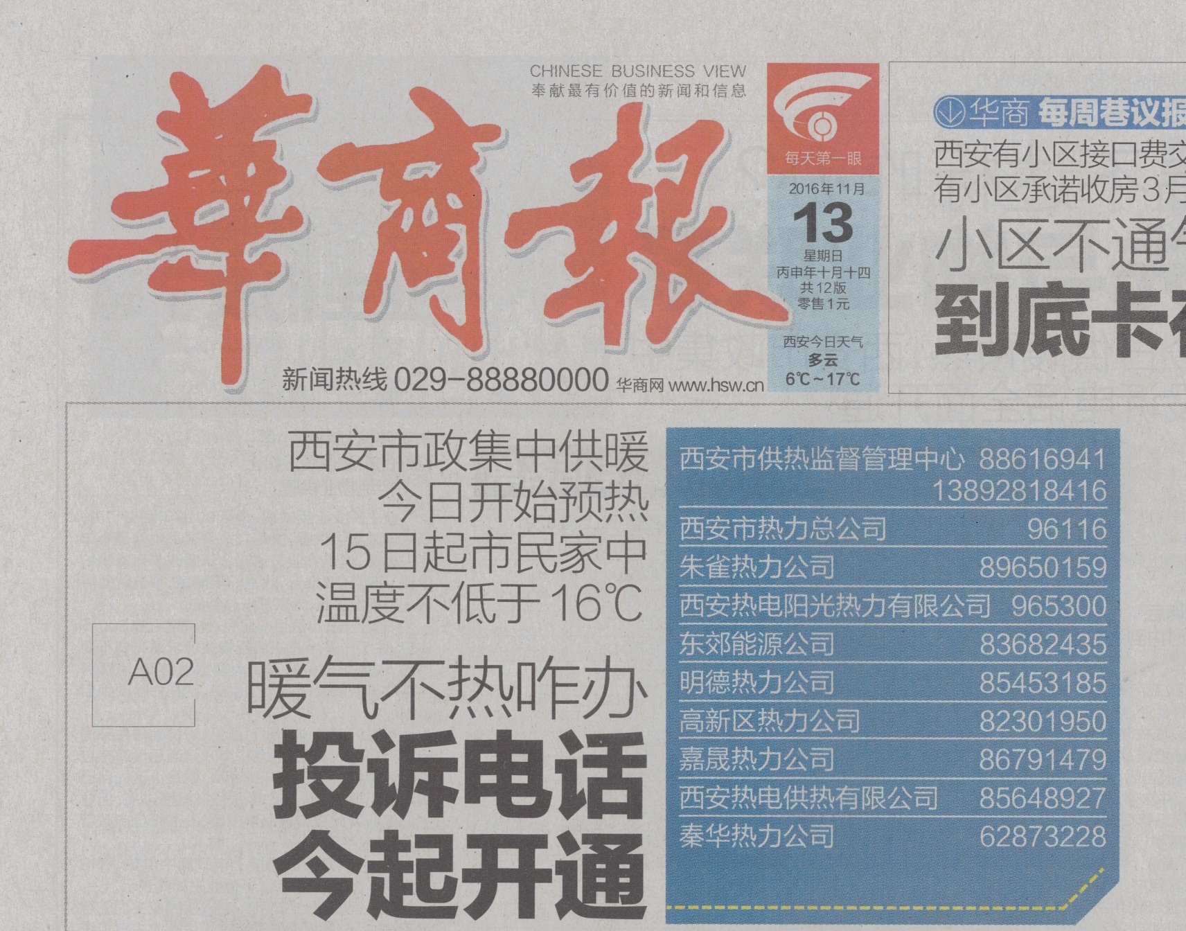 西安市政府通过媒体正式对社会公布我公司市政集中供热服务电话:029-62873228