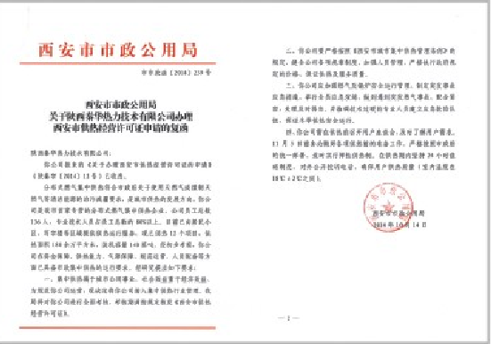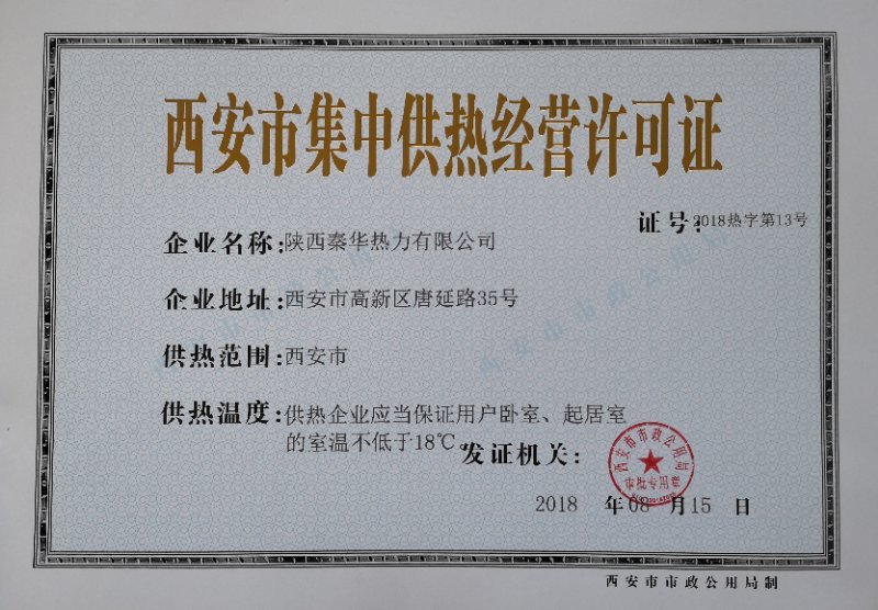 西安市政府颁发《西安市供热经营许可证》